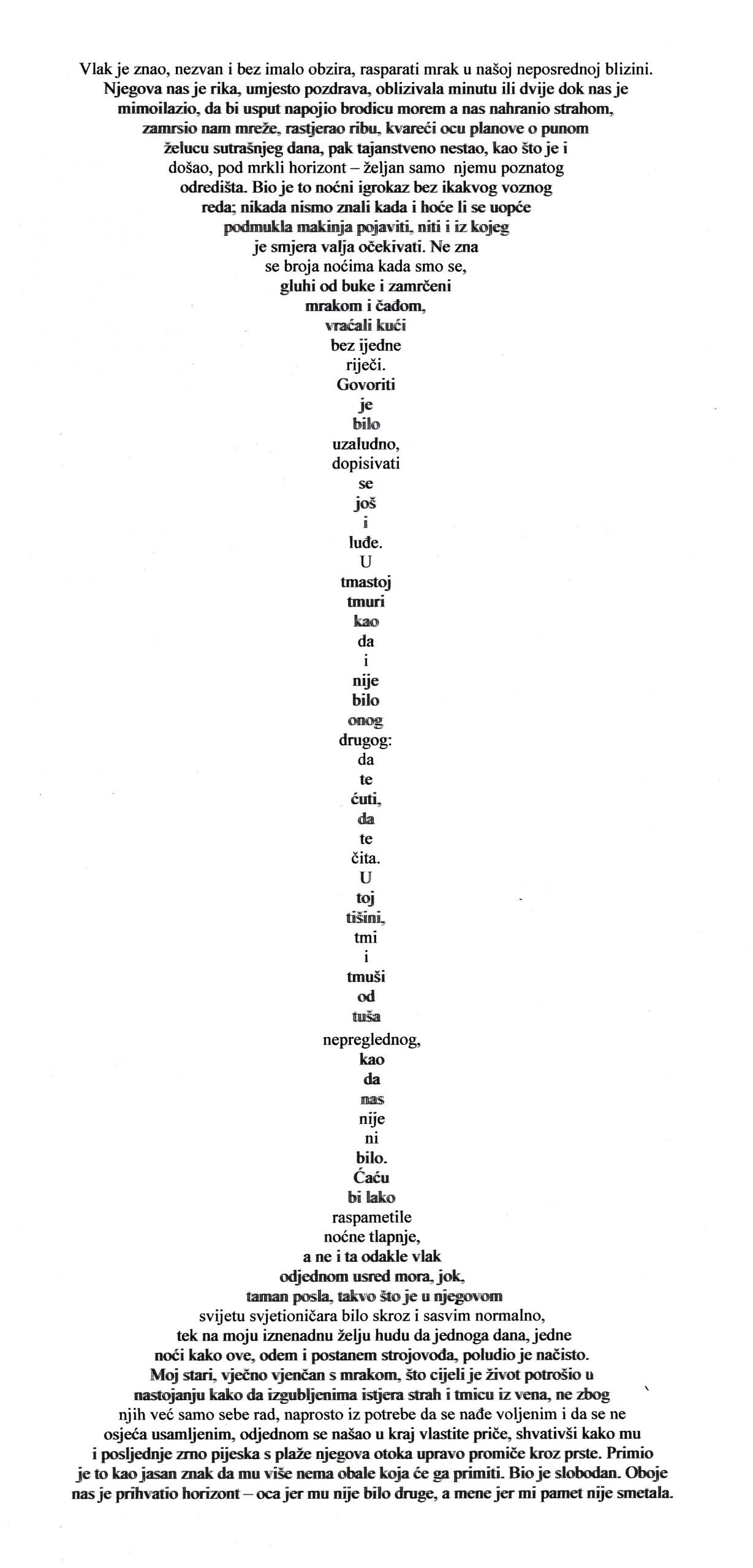 Znaju oni da to što rade nema smisla, niti je više ovo bila njegova radnja, niti je u kasabi ostalo ljudi kojih bi se ticala njegova smrt, pa da se o njoj izvijeste s ovog izloga. Onih stotinjak preostalih katolika za smrt bližnjeg obično saznaju odmah, iz druge sobe ili, u najgorem slučaju, preko taraba. Ali svejedno ne odustaju, lijepe smrtovnicu, možda najprije zato da uznemire one druge. Da im kažu kako nas još ima, makar i mrtvih.